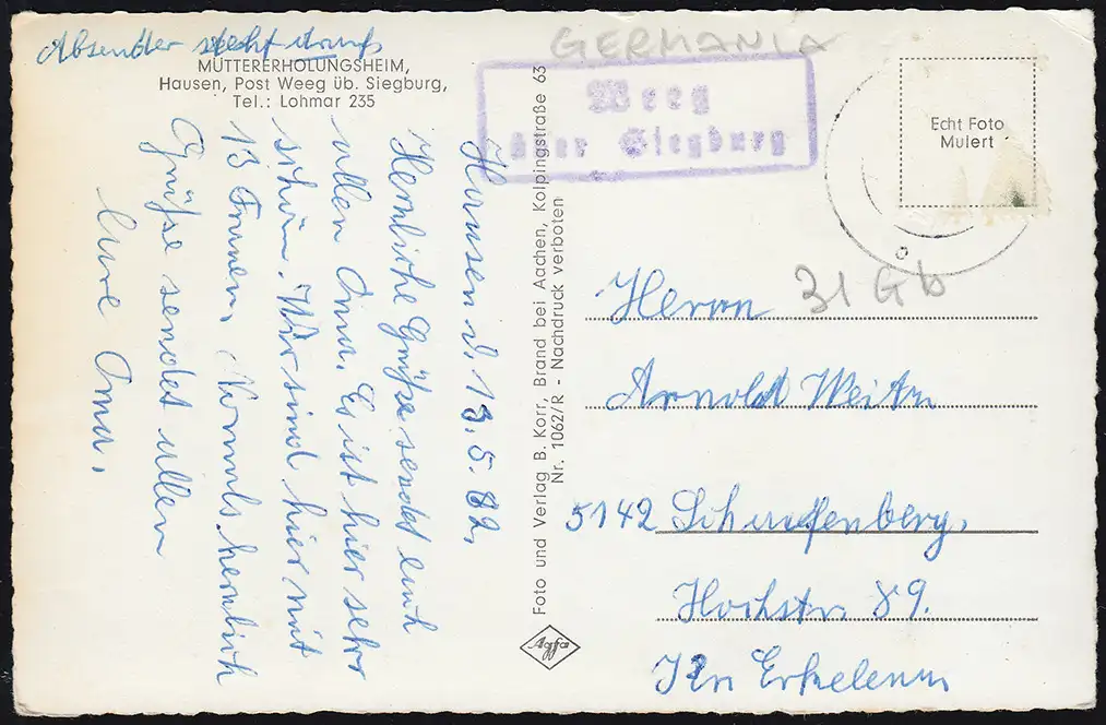 Landpost Weeg sur Siegburg sur AK Muttererretentesheim Hausen, couru 1962