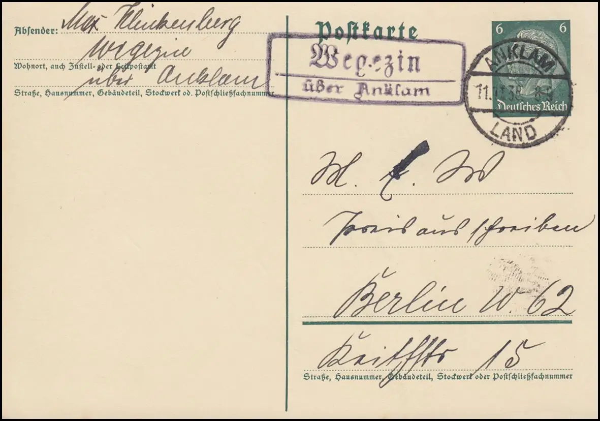 Landpost Wegenzin via Anklam LAND 11.11.1935 sur carte postale P 226I vers Berlin