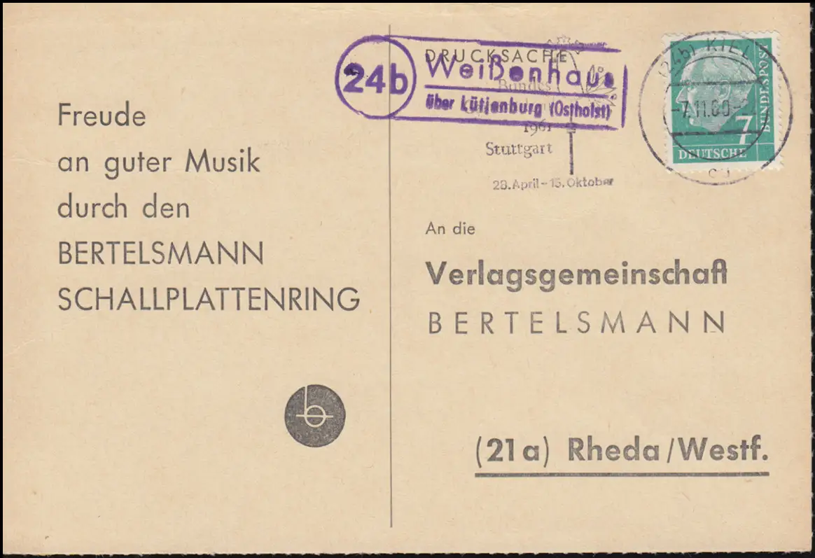 Landpost Weisenhaus sur Lütjenburg (Estholst) sur carte postale KIEL 7.11.1960