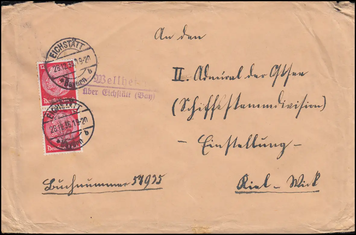 Landpost Wellheim sur EICHSTETT (Bayern) 28.12.1936 vers Kiel Wik