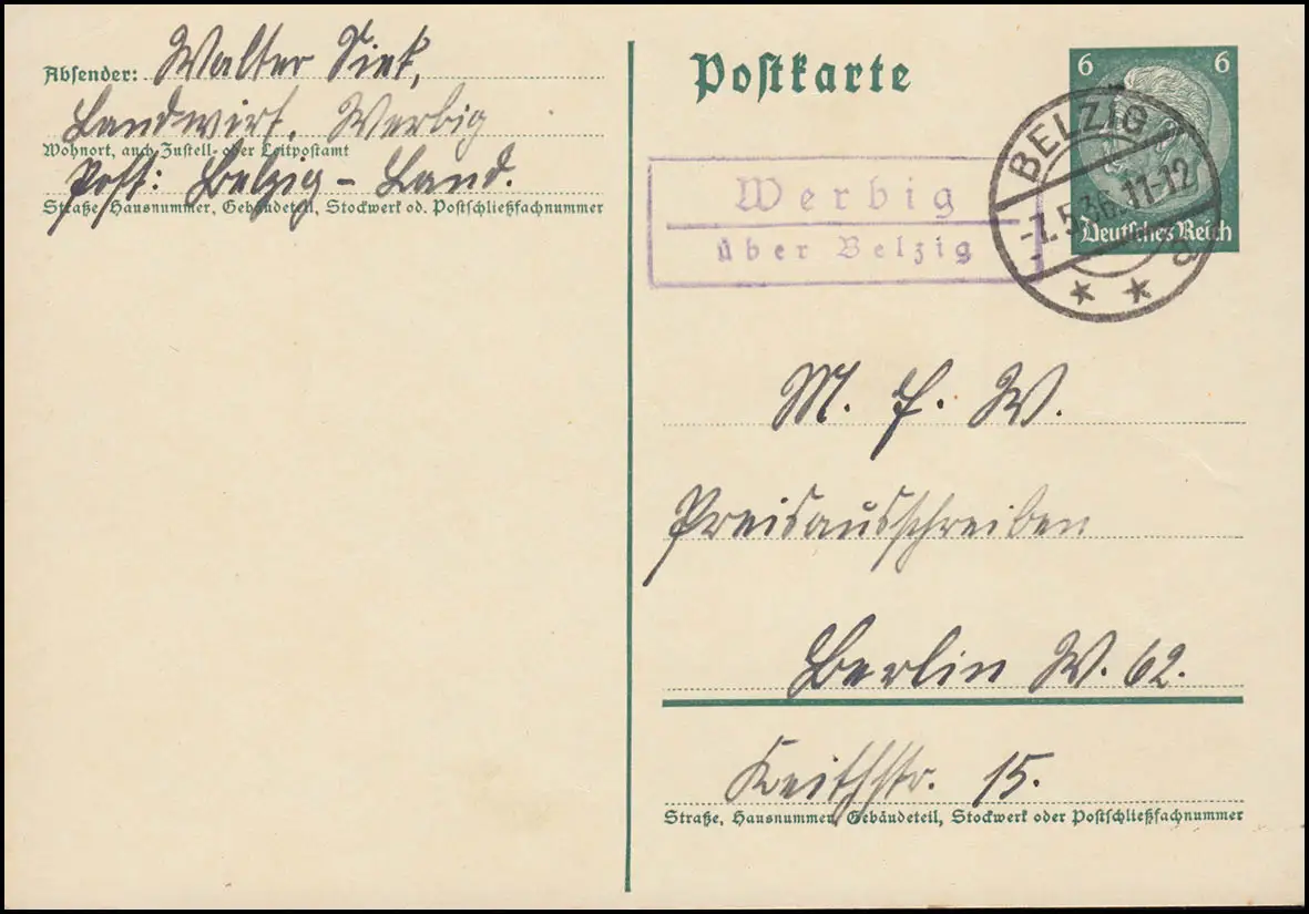Landpost Werbig via BELZIG 7.5.36 sur carte postale pour Berlin