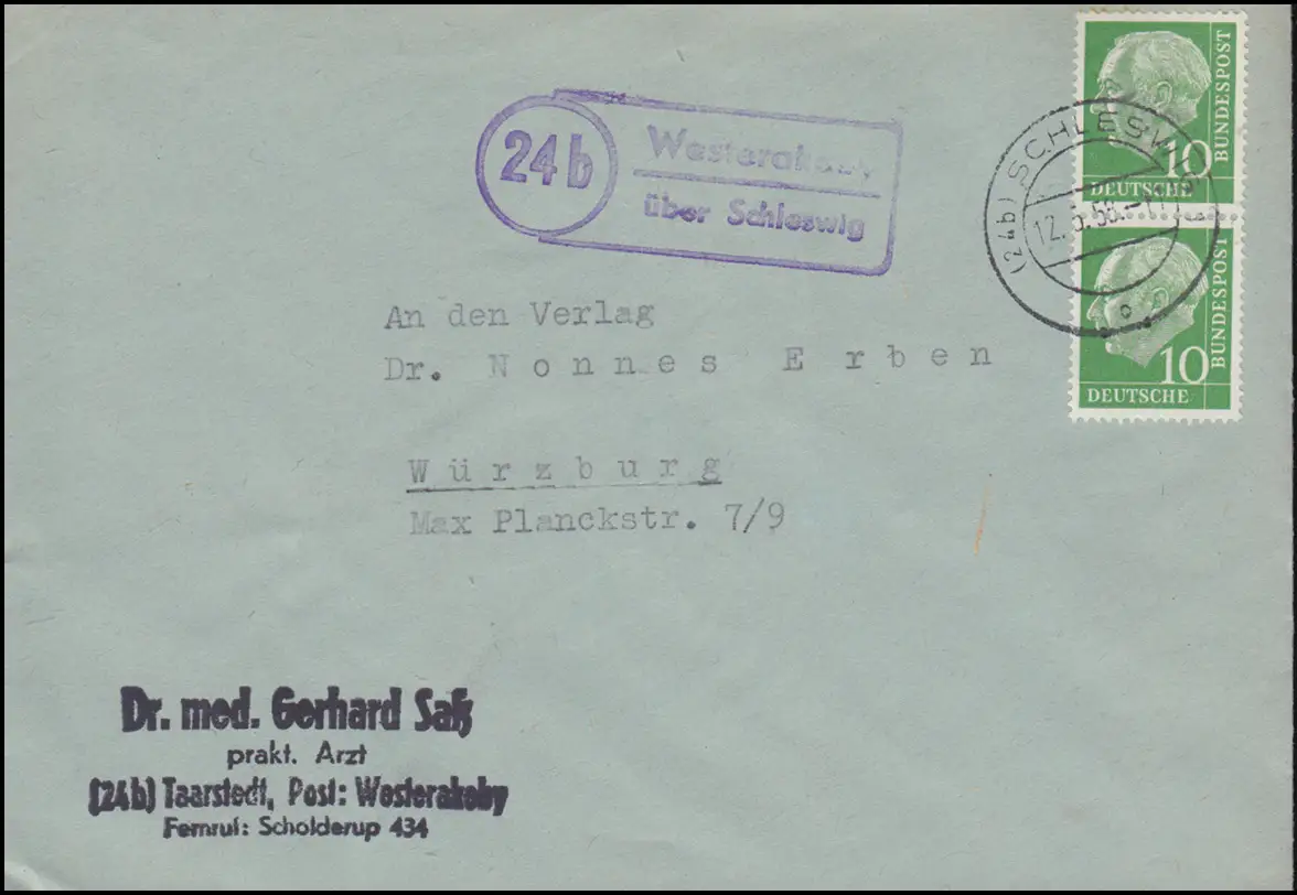 Landpost Westerakeby sur SCHLESWIG 15.5.1958 sur télex à Würzburg