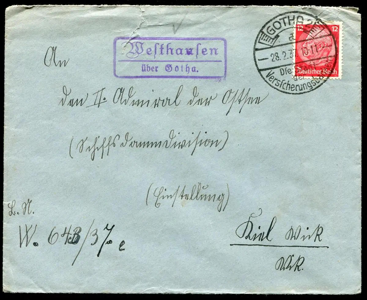 Landpost Westhausen sur Gotha sur lettre SSt GOTHA banques d'assurance 28.2.37