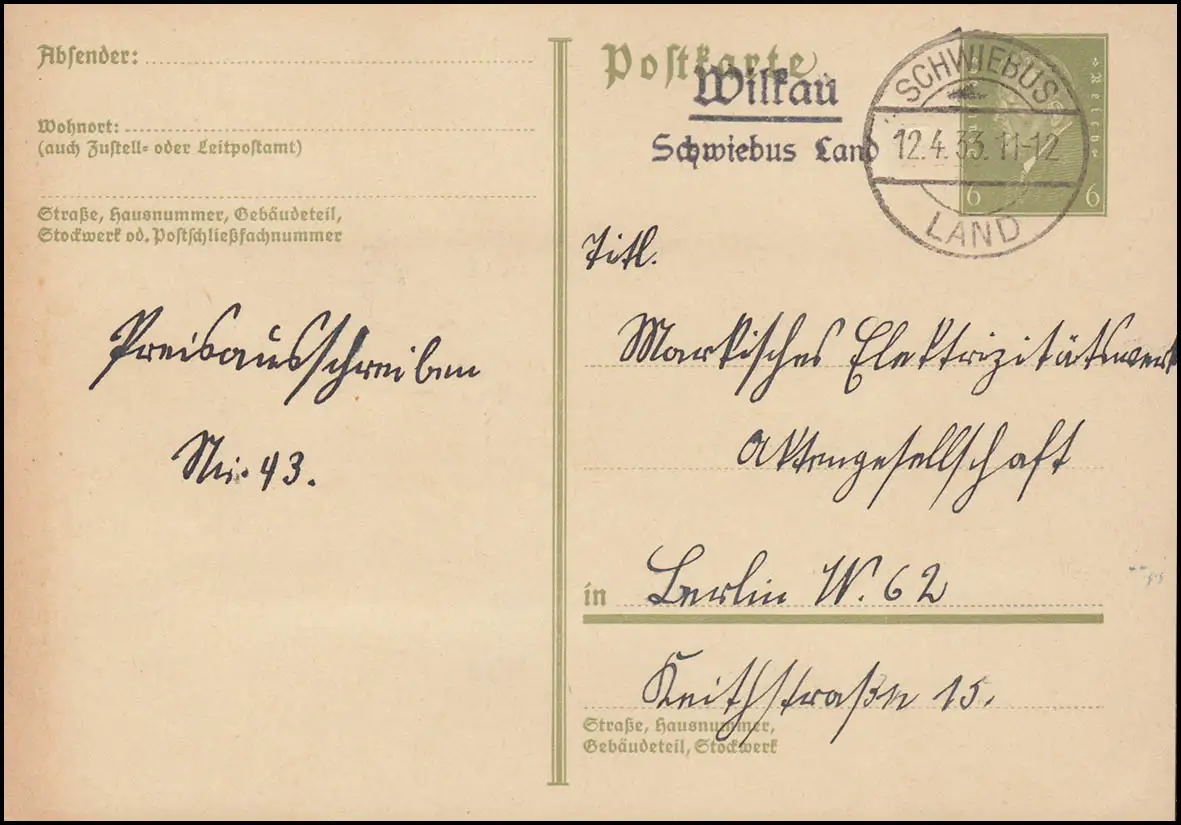 Landpost Wilkau / SCHWIEBUS LAND 12.4.33 sur carte postale vers Berlin