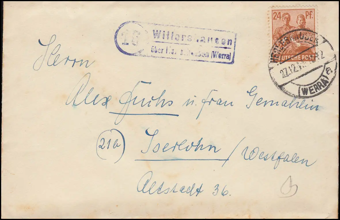 Landpost Willershausen sur HERLESHAUSEN (WERRA) 27.12.47 sur lettre