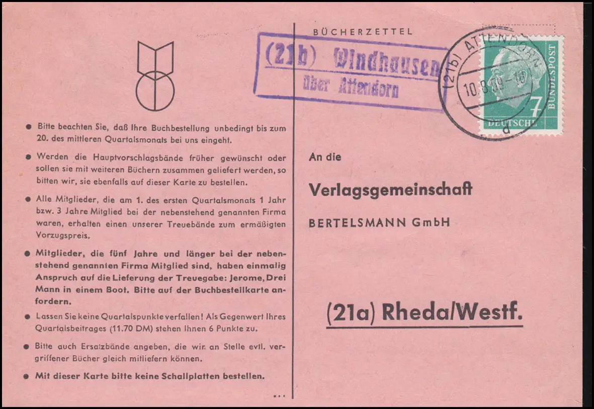 Landpost Windhausen par l'intermédiaire d'ATTENDORN 10.8.1958 sur carte postale à Rheda/Westf.