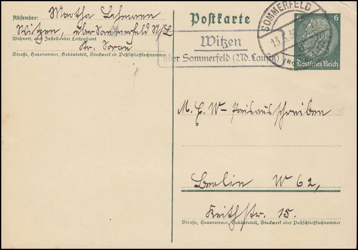 Landpost Witzen sur SOMMERFELD (NIEDERLAUSWEI) 13.5.36, carte postale à Berlin