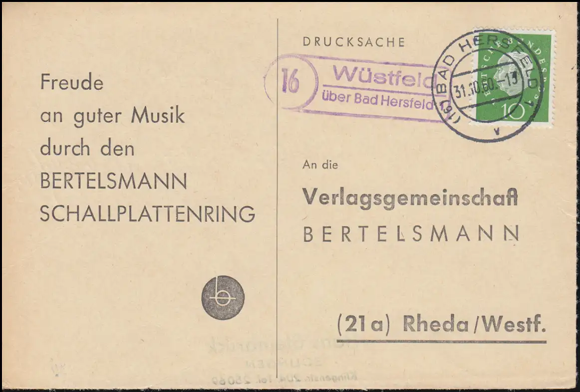 Landpost Wüstfeld au sujet de BAD HERSFELD 31.10.1960 sur l'impression après Rheda/Westf.