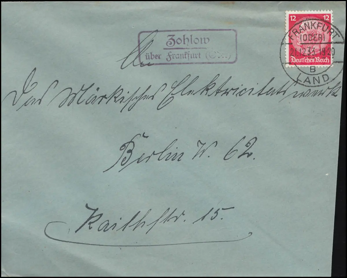 Landpost Zohlow über Frankfurt Oder 21.12.1933
