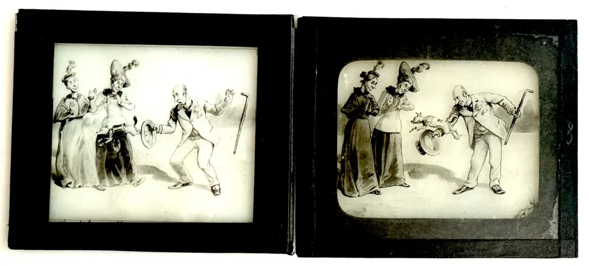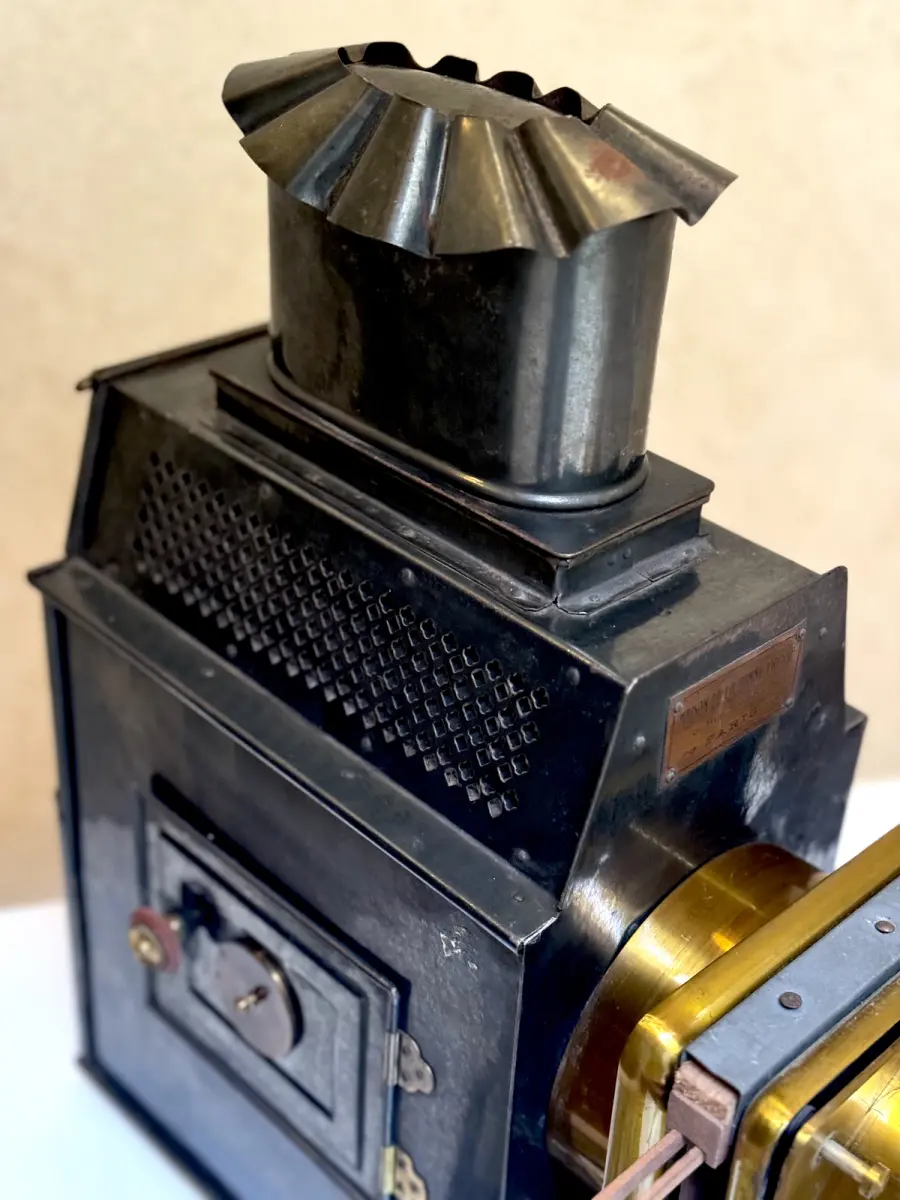 La lanterne magique est l’ancêtre des appareils de projection, elle permet de projeter des images peintes sur des plaques de verre à travers un objectif, via la lumière d’une chandelle ou d’une lampe à huile.
