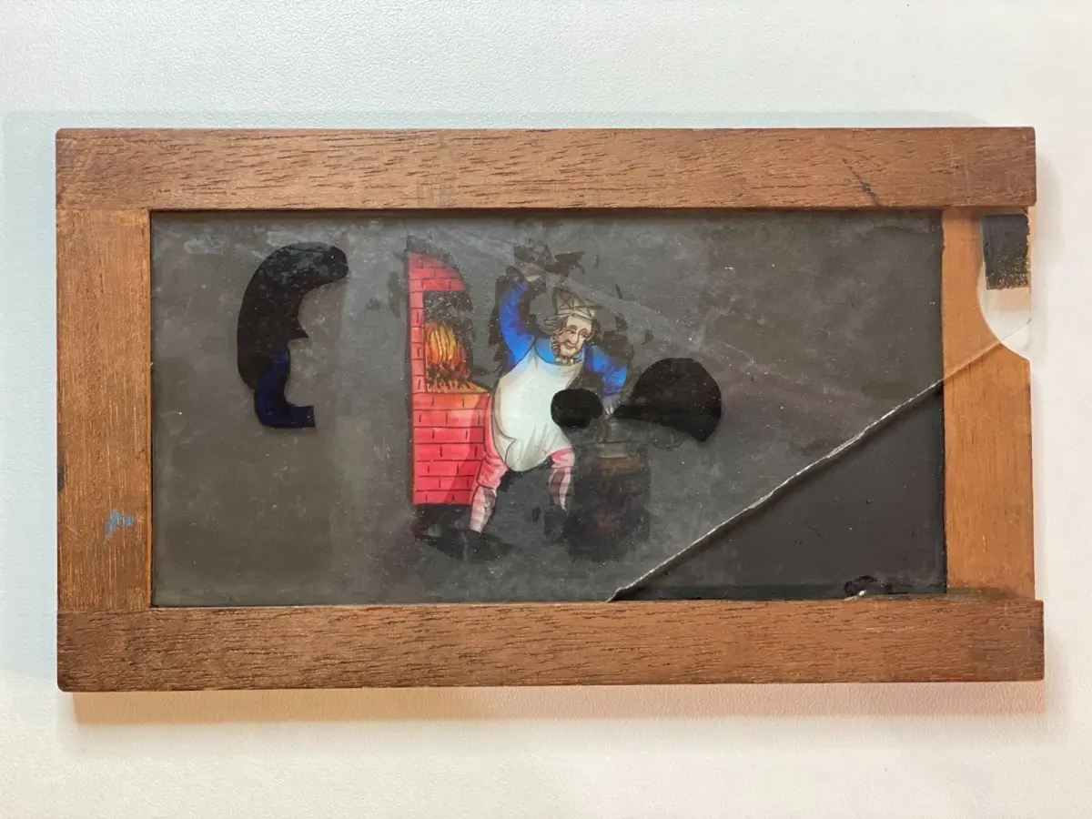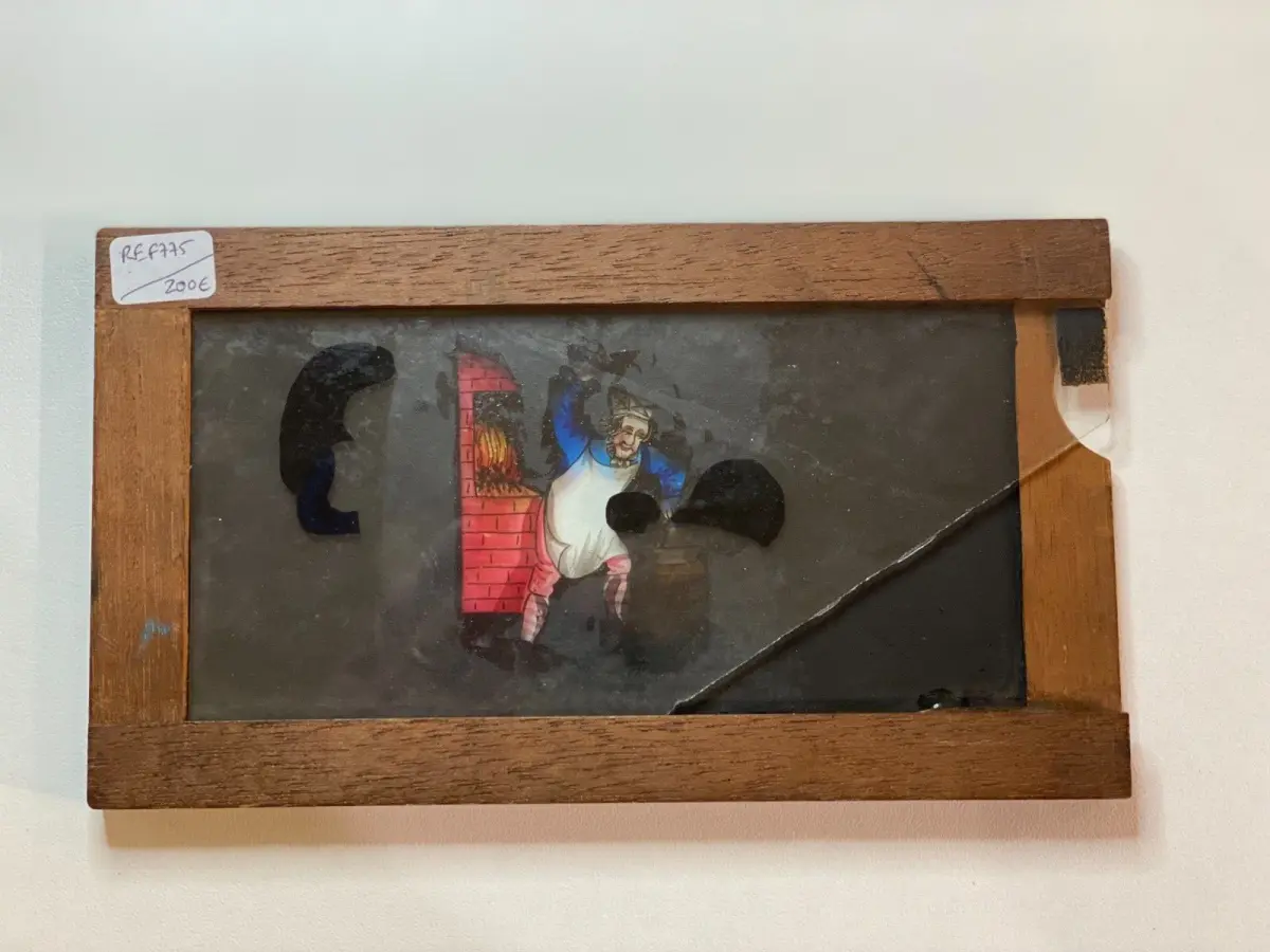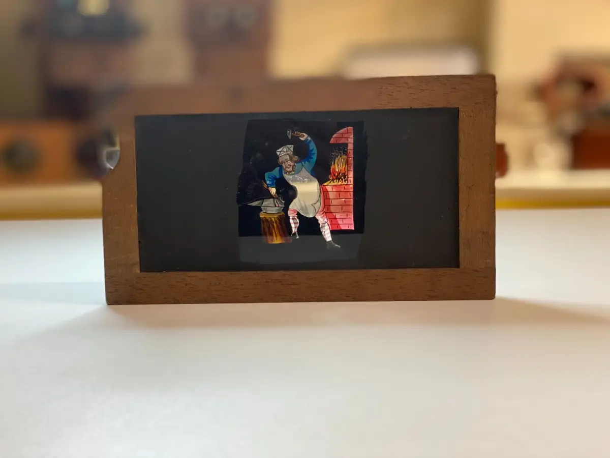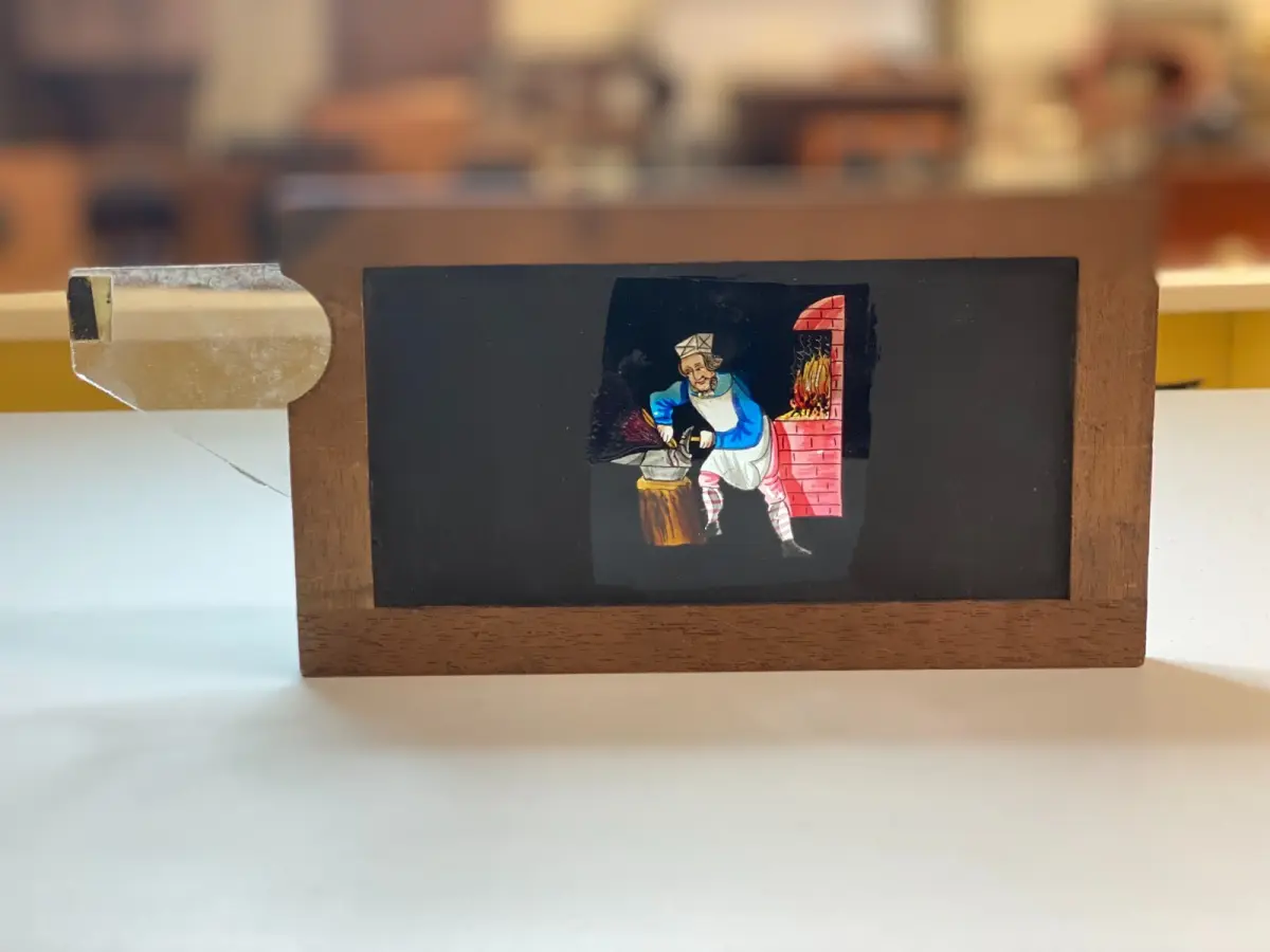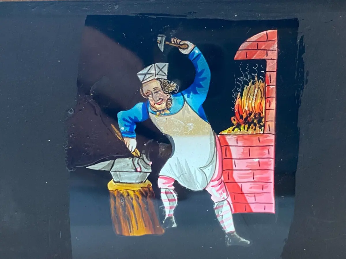 Plaque à système pour lanterne magique figurant un forgeron en train de façonner une ferronnerie. Elle est composée d'un cadre en bois renfermant deux plaques en verre peint.