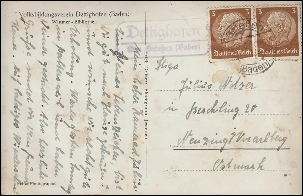 Le courrier de Landpost DETTIGHOFEN sur GRIEßEN Baden 15.10.42 sur la photo AK Wittmer Bibliothèque