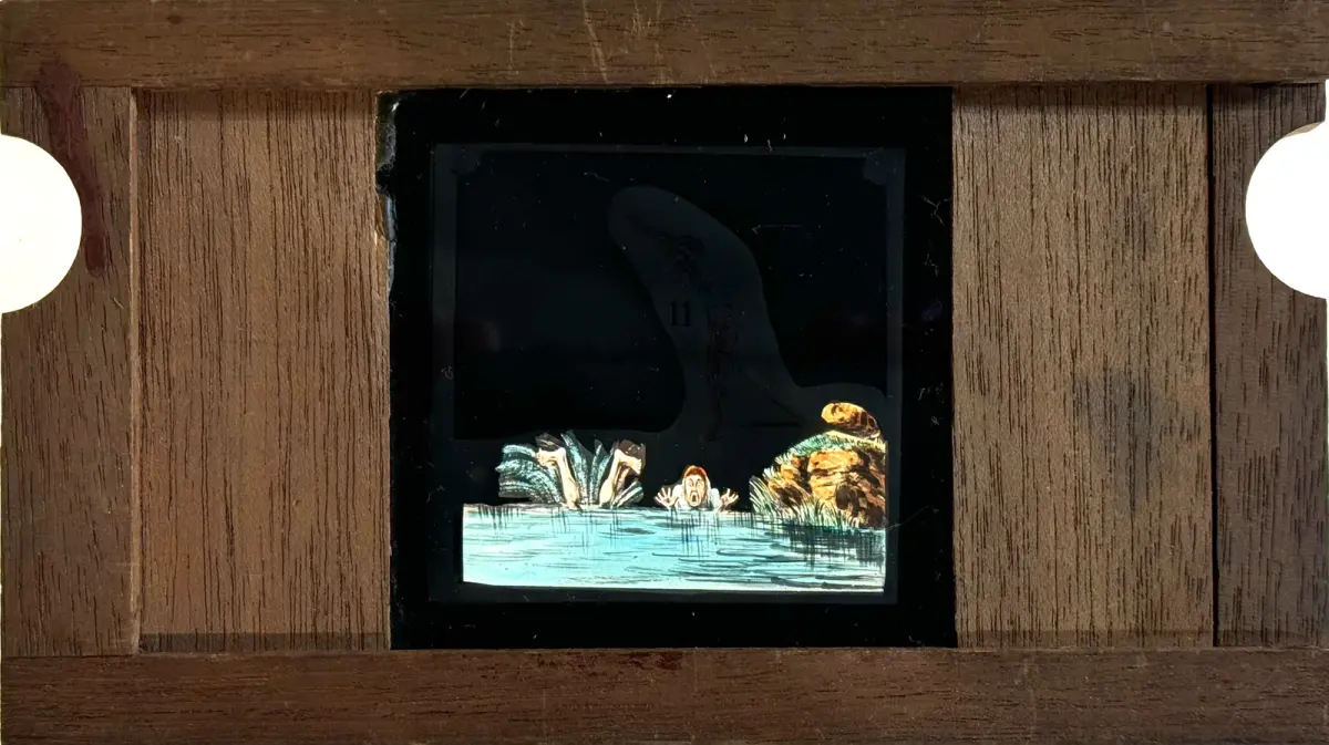 Plaque à système humoristique intitulée "Le plongeon" pour lanterne magique.