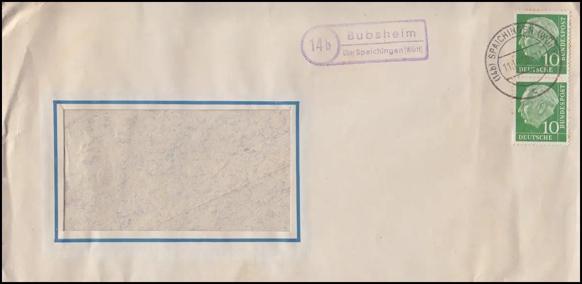 Le temple de Bubsheim de Landpost sur SPAICHINGEN 11.10.58 sur enveloppe de lettre de fenêtre