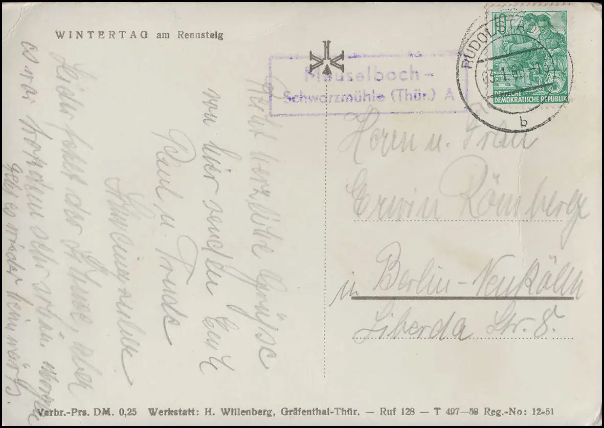 Le temple de Landpost Meuselbach-Nachzmühle (Thür.) A, RUDOLSTADT 3.1.60 sur AK