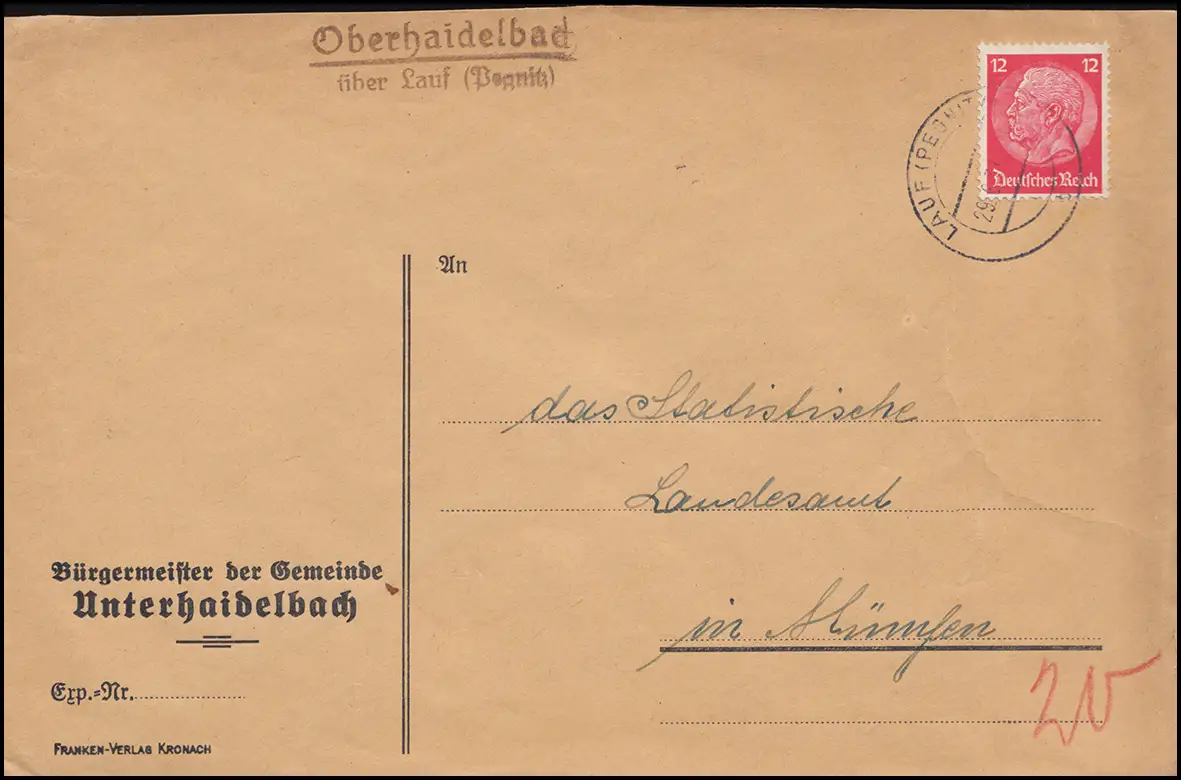 Le temple de Landpost Oberhaidelbach sur le Lau (PEGNITZ) 29.6.37 Lettre à Munich