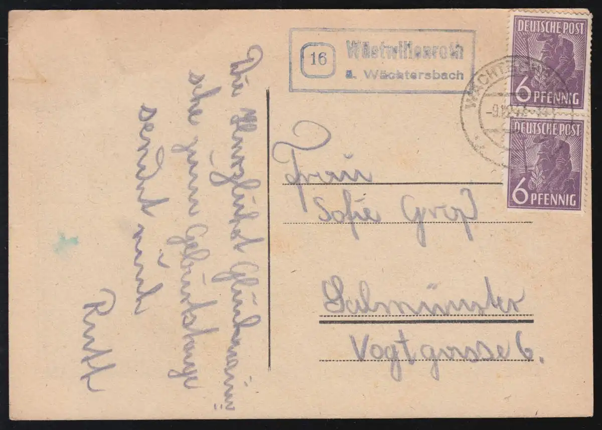 Le temple de la campagne de Wüstwillenroth sur WACKSBACH 9.12.1947 sur carte