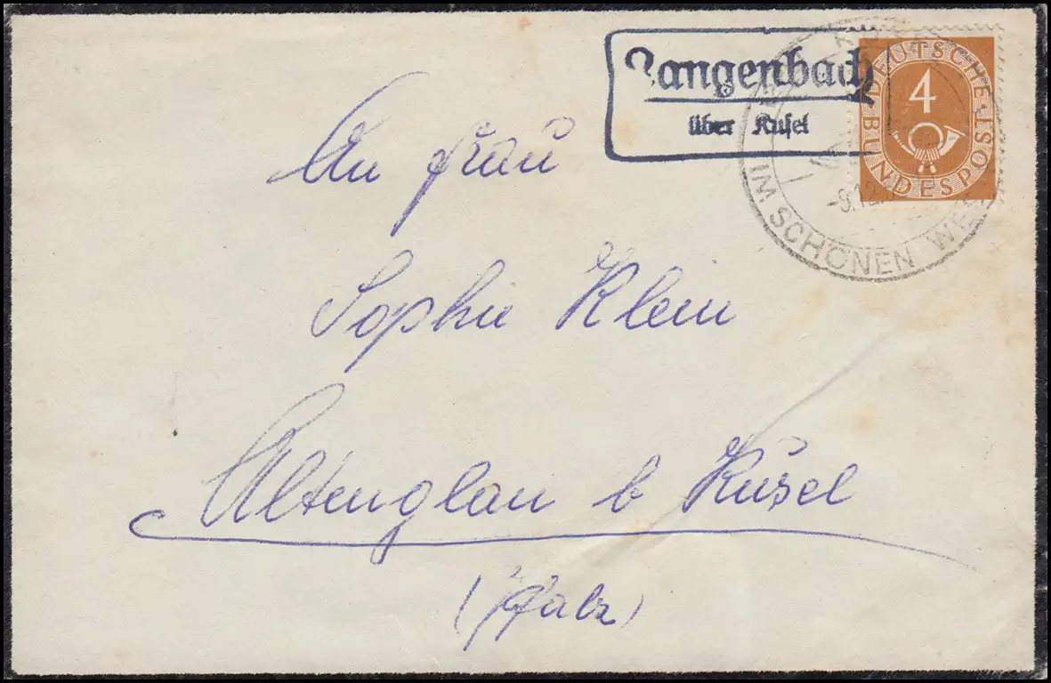 Le temple de la poste de Landpost Langenbach sur Kusel sur l'impression SSt KUSEL 9.12.1952