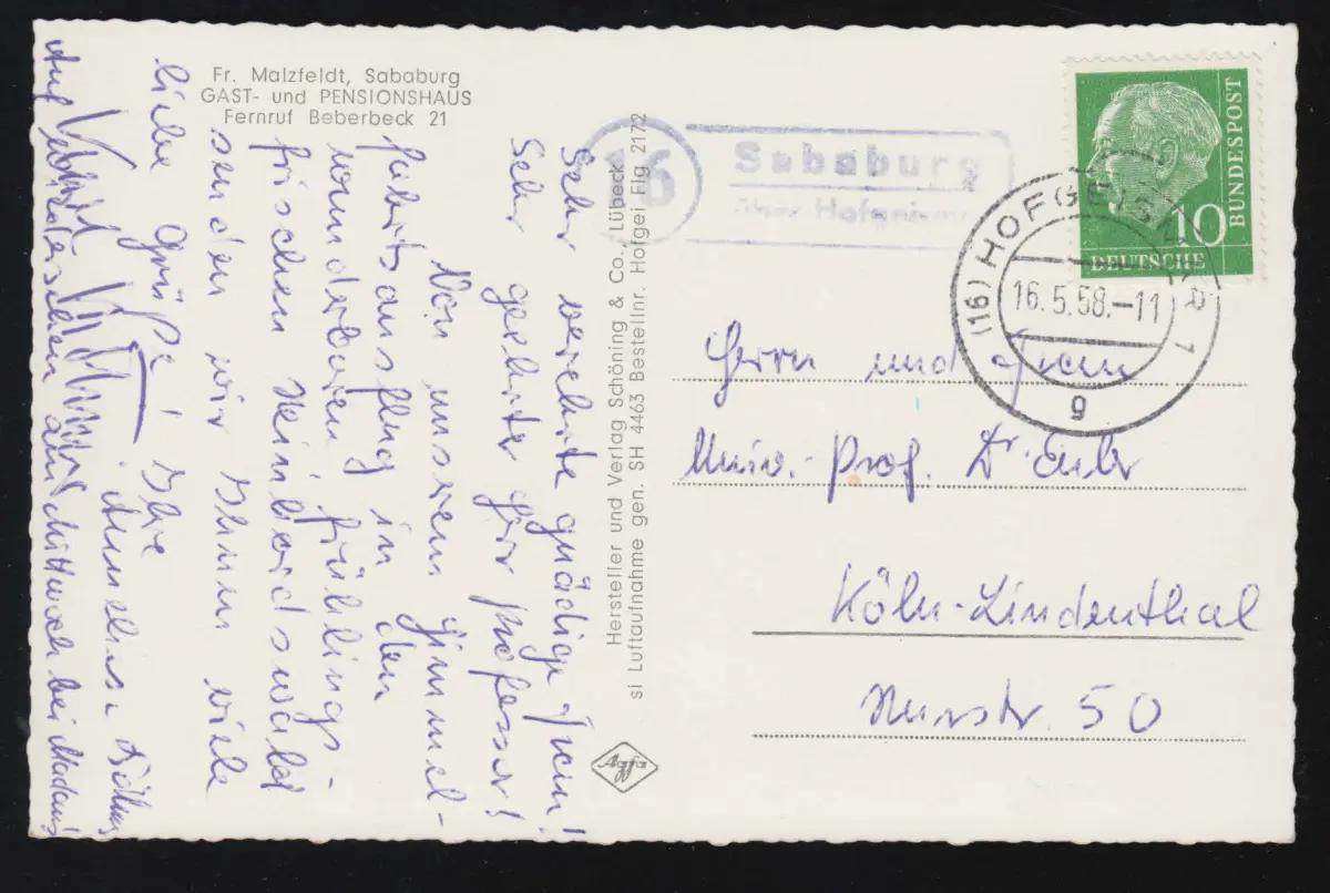Le temple de la poste de Landpost Sababurg sur Hofgeismar 16.5.58 sur AK Le Sababbourg