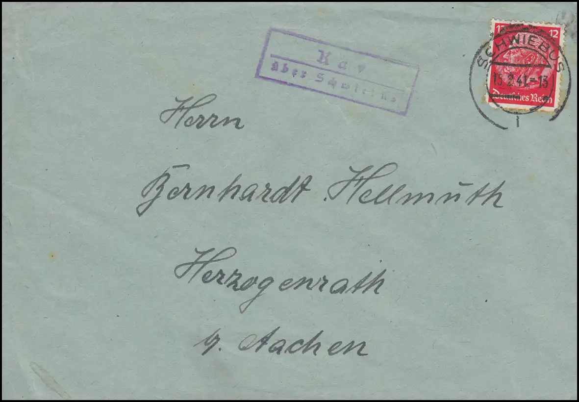 Le temple de la poste de campagne Kay sur la lettre de Schwiebus SCHWIEBUS 15.2.1941 à Herzogenrath