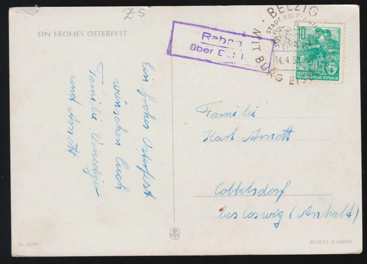 Le temple de la poste de campagne Raben sur BELZIG SST VILLE AU FLÄMING 14.4.1960 sur AK Pâques