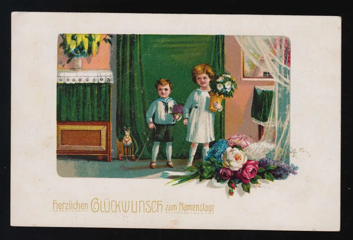 Les enfants avec des fleurs & jouet dans Stube Félicitations Nom, Kraiburg 1.12.1917