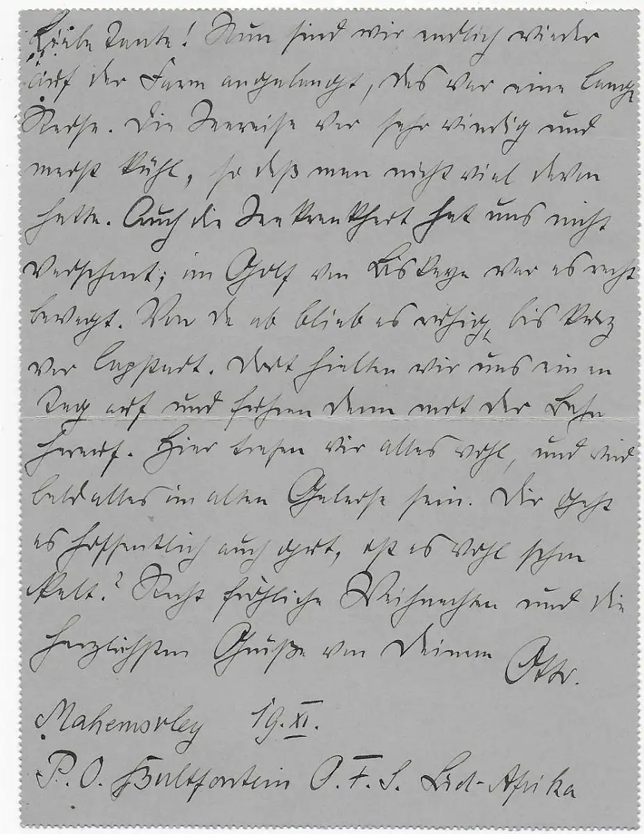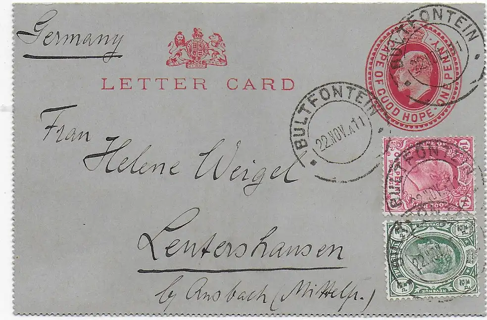 Letter card Bultfontein 1911 to Lentershausen/Ansbach