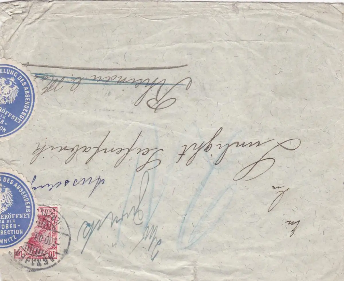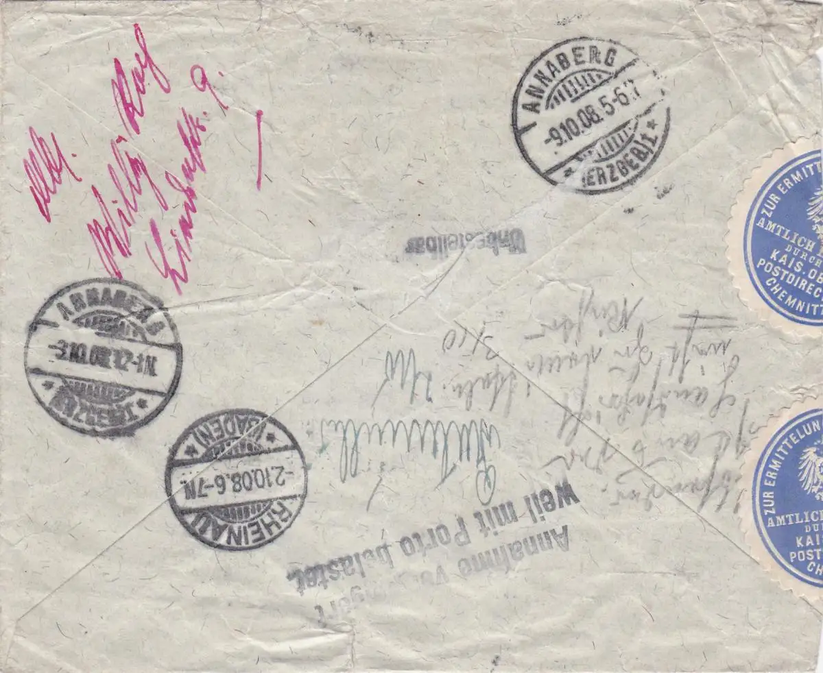 Lettre 1908 Annaberg à Rheinau et retour-Lettre ouverte identification de l'expéditeur