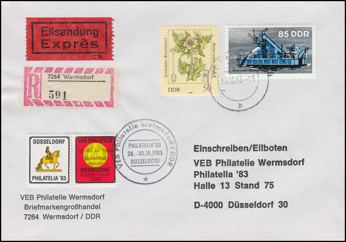 Lettre DDR à la Philatelia'83 à Düsseldorf MiF Eil-R-Bf WERMSDORF 25.10.1983