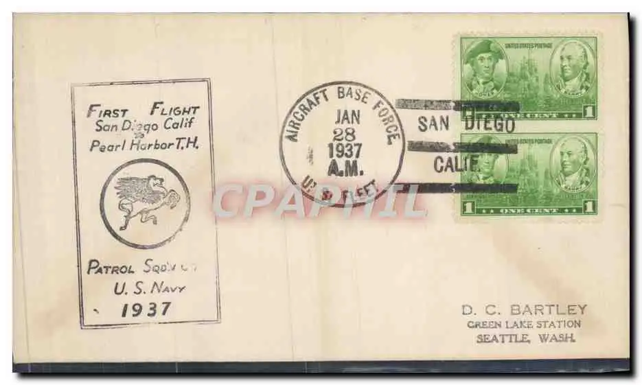 Lettre Etats Unis 1st flight San Diego Pearl Harbour 28 1 1937