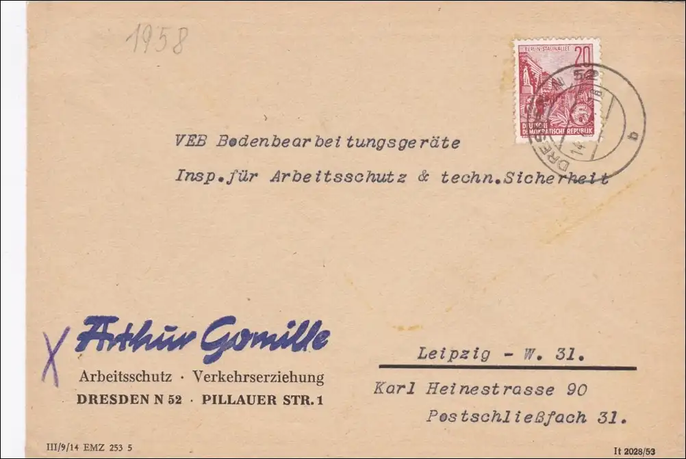 Lettre Protection du travail-éducation de la circulation Dresde après Leipzig 1958, verso