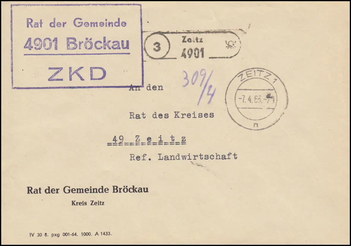 Lettre ZKD Conseil de la municipalité de Bröckau comme lettre locale TEMPEZ 7.4.65 au conseil de district