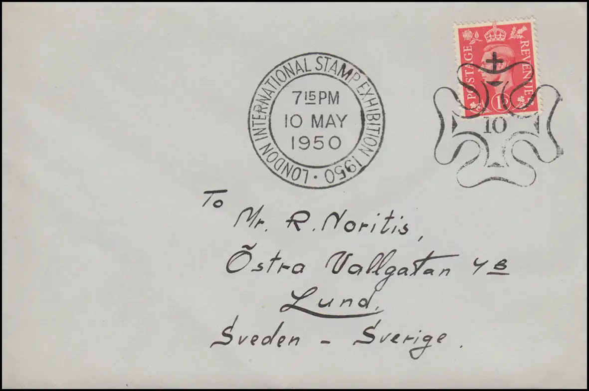 Lettre d'Angleterre avec exposition internationale de timbres LONDRES 10.5.1950
