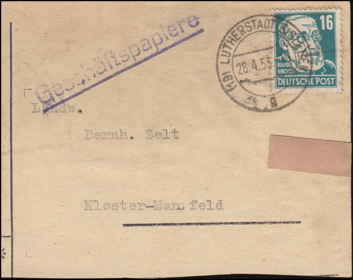 Lettre de 16 pfennig Virchow LUTHERSTADT FERME 28.4.1953