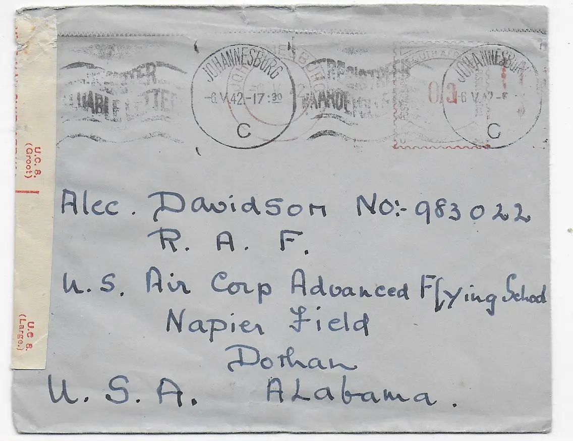 Lettre de Johannesburg, 1942 aux États-Unis - Dorhan AL, Censor