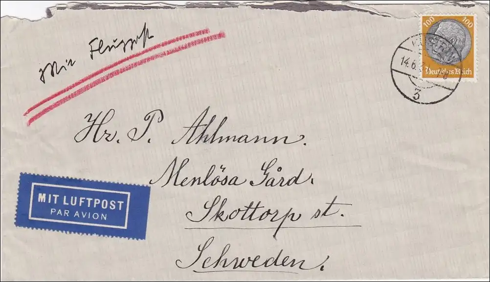 Lettre de Kustrin à l'aéroport de Suède 1931