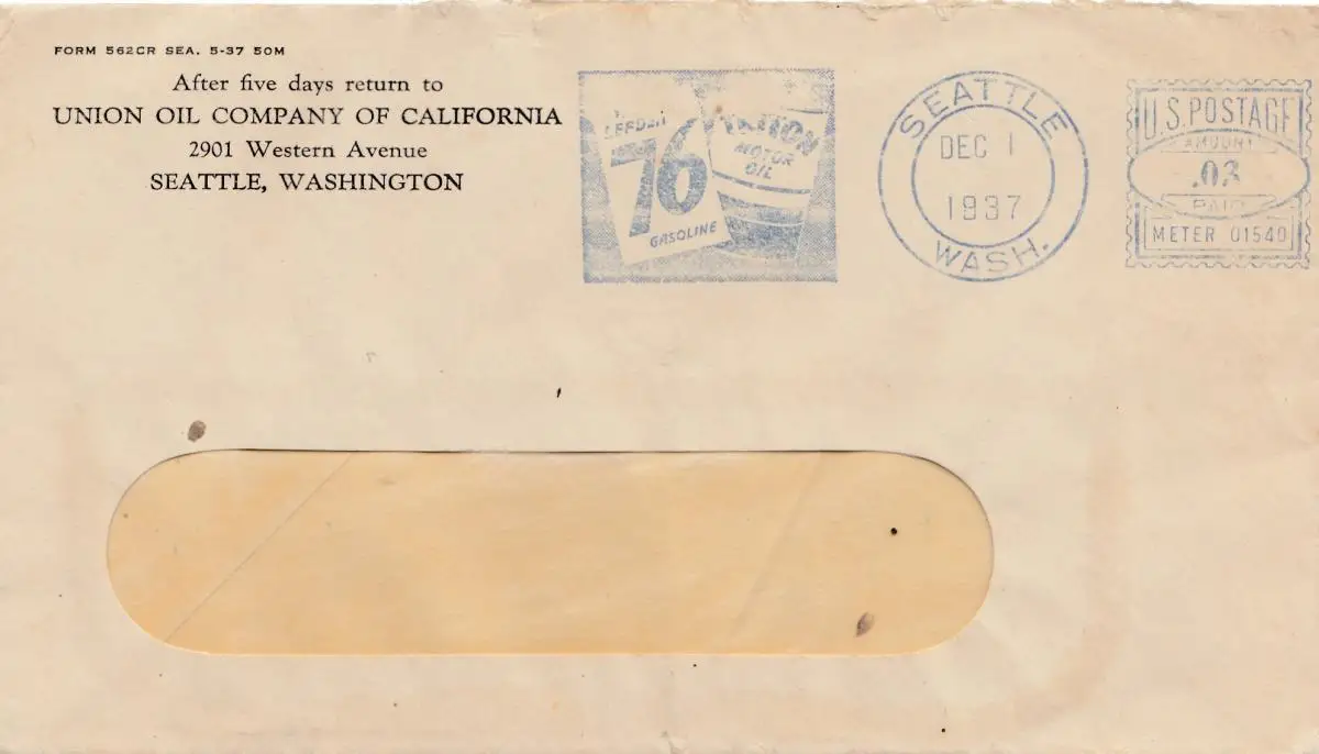 Lettre de Seattle/Washington de l'Union Oil Company of Carlifonia 1937