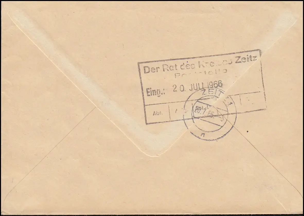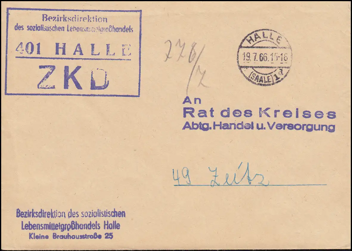 Direction du district du commerce de gros socialiste Hall / Salle comme poste de service avec le cachet d'arrivée "ZEU 20.7.66" et le timbre d 'entrée au "Rat de Kreises Zeuetz20.7.1966" Département Commerce et approvisionnement Contrôle: original Référence: 00000000023973>Note: Cet article n'est disponible qu'une fois. Vous recevrez exactement l'article représenté.