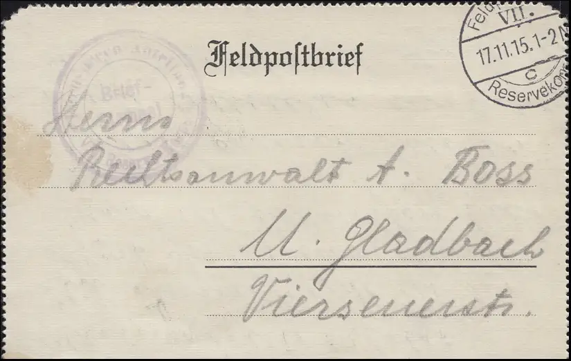 Lettre de carte de poste de terrain Service téléphonique FELDPOST c - VII Corps de réserve 17.11.15