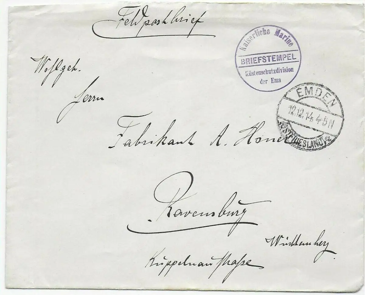 Lettre de champ Postier Marine Impériale, Division de la Protection côtière des Ems, Emden 1914