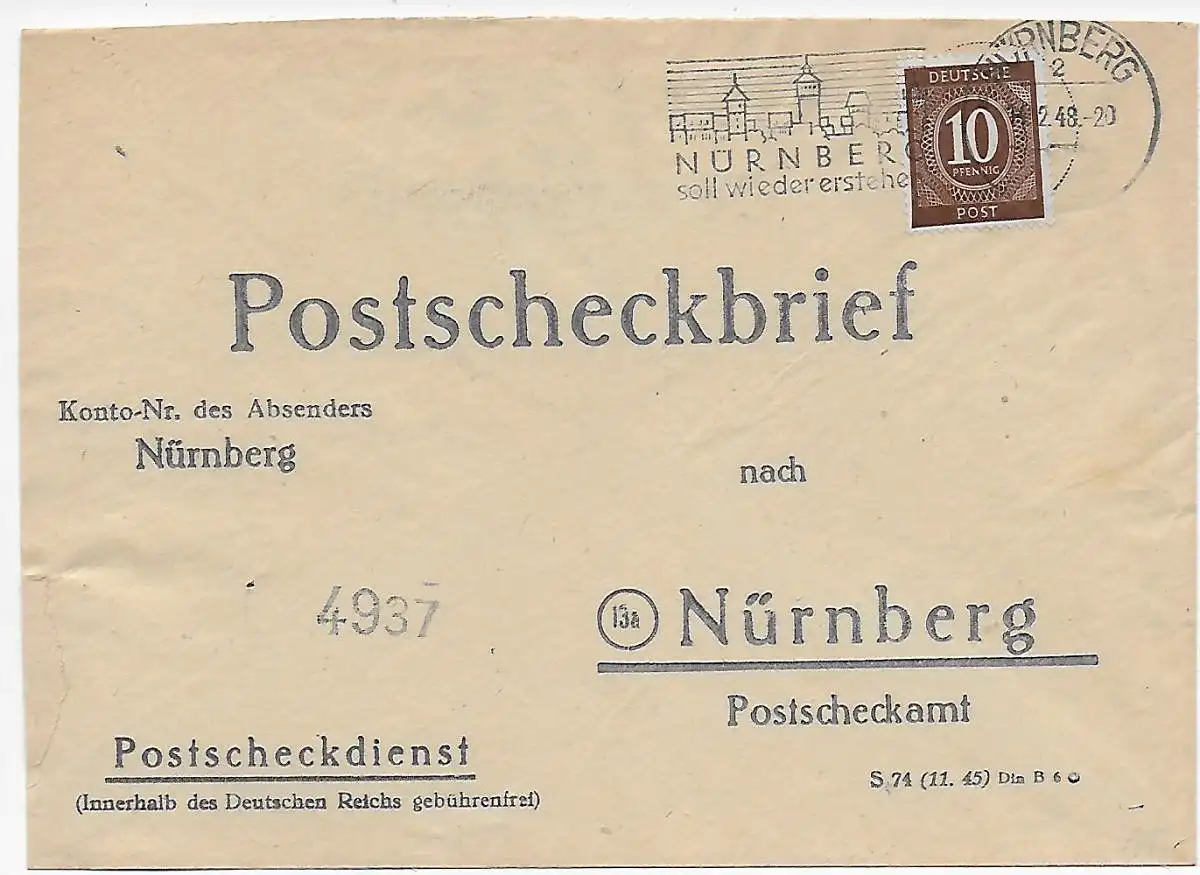 Lettre de chèques postaux Nuremberg, 1948