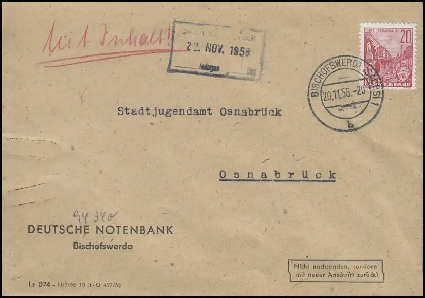 Lettre de la DDR Deutsche Note Bank BISCHOFFSWERDA 20.11.56 à l'Office des mineurs Osnabrück