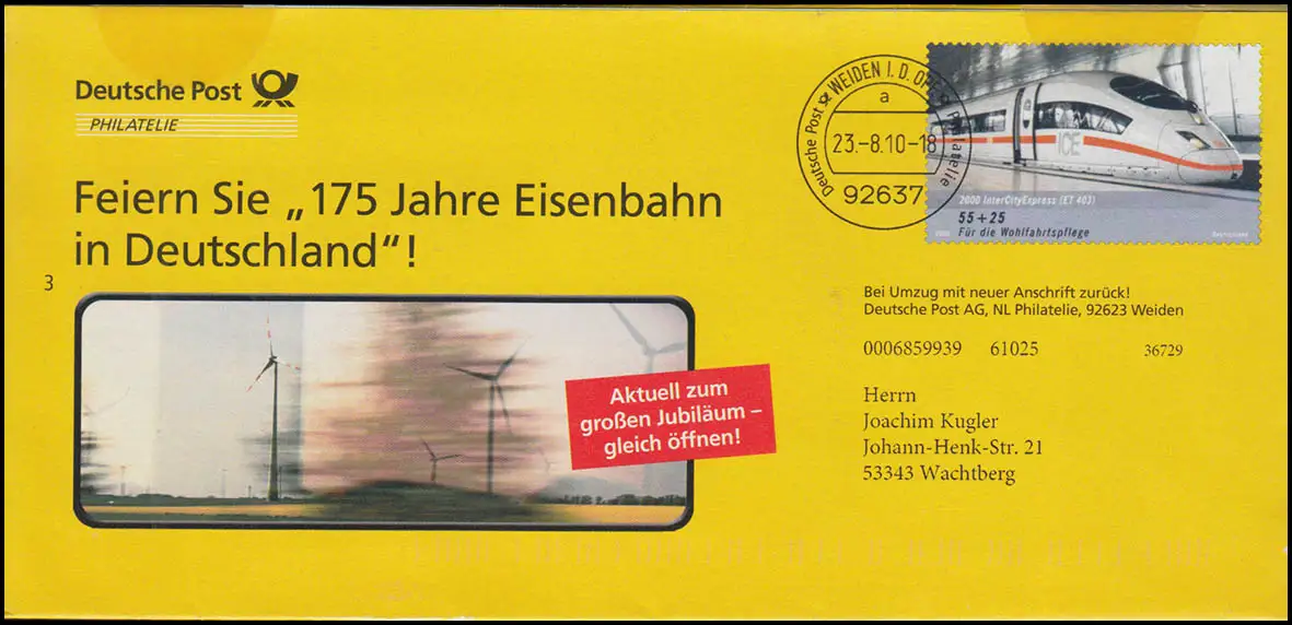 Lettre de plus F500 ICE 175 ans de chemin de fer en Allemagne, WEIDEN 23.8.2010