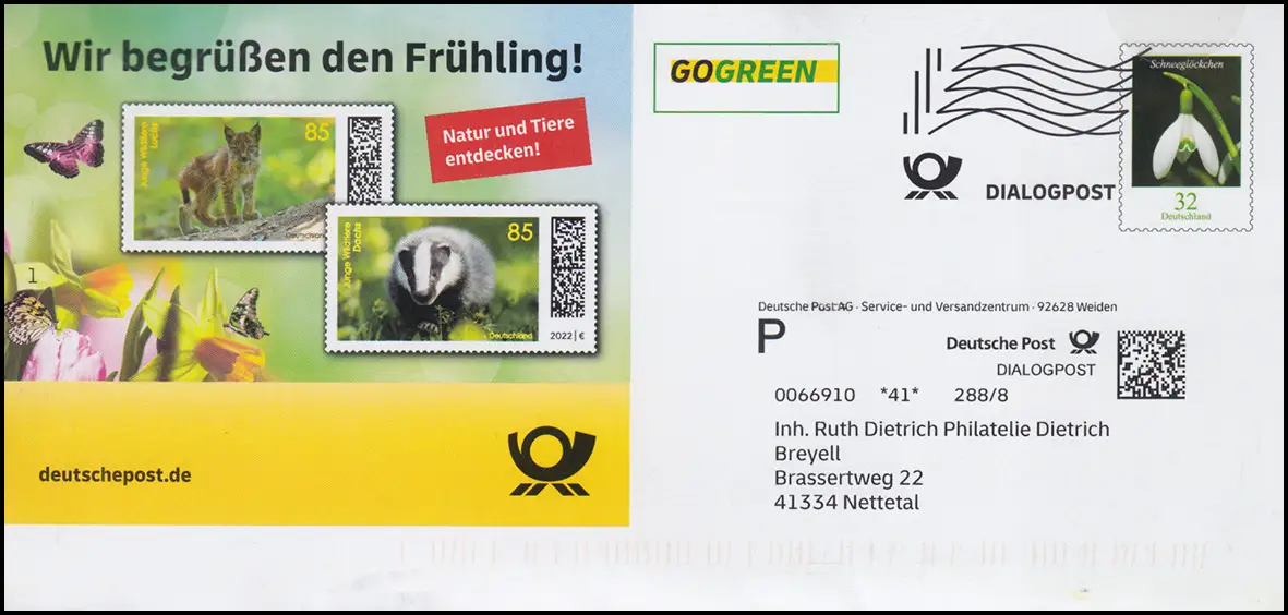 Plusschild Auto-éditions de la Deutsche Post avec le cachet officiel et avec Frankierwelle / Nous saluons le printemps! - Nature et Teire découvrir! Au dos: Joyeuses Pâques! Examen: original Référence produit: 00000000039963