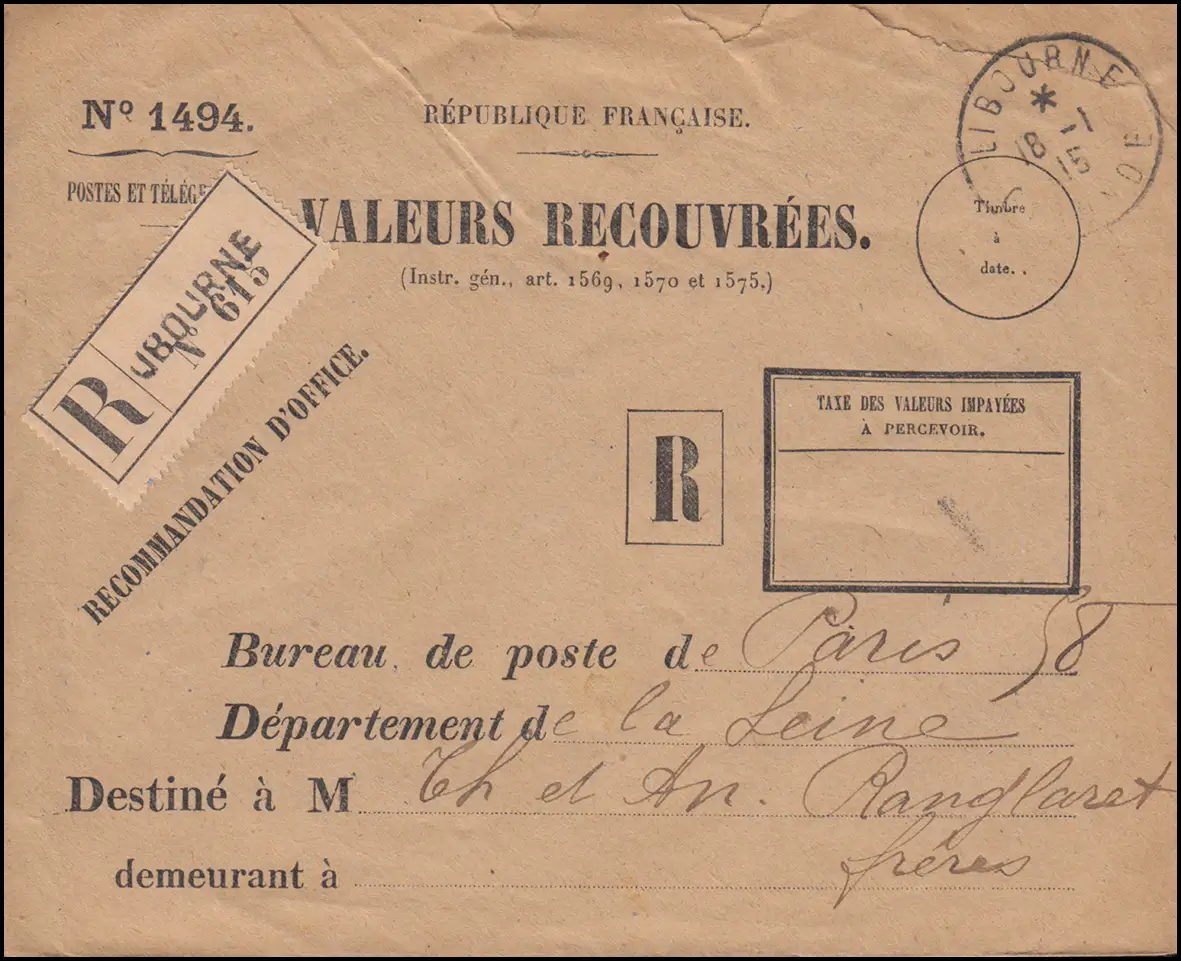 Lettre de service VALEURS RECOUVRES en tant que lettre R Not-R-Zettel LIBOURNE 18.1.1915