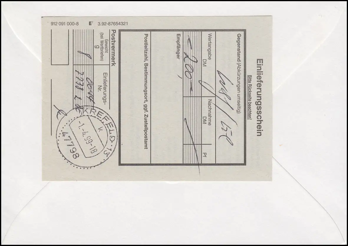 Lettre de valeur à l'étranger avec autocollant code-barres ATM 1660 Pf. FDC ET-O KREFELD 1.4.99