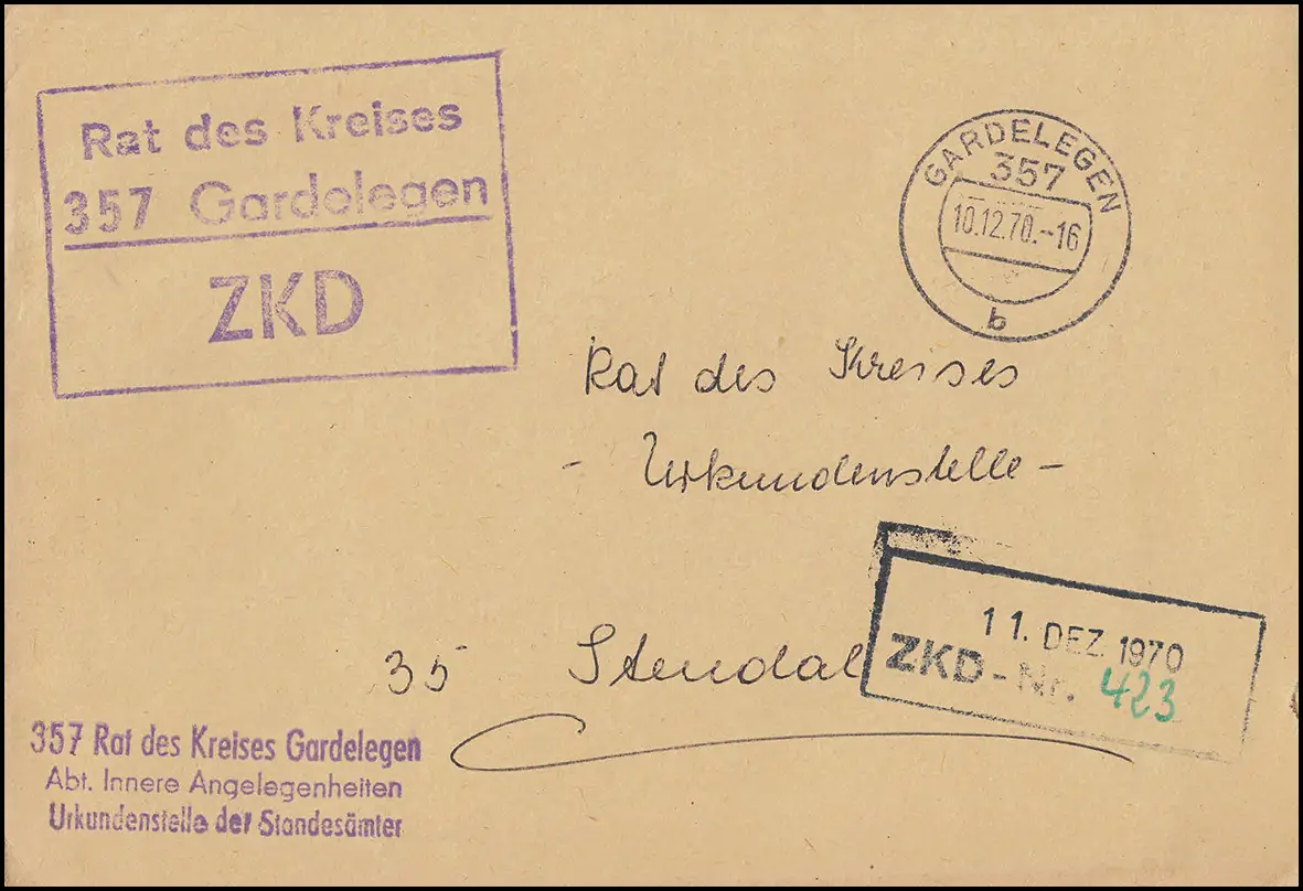 Lettre du ZKD Conseil du district de GARDELEGEN 10.12.70 selon STENDAL 11.12.1970