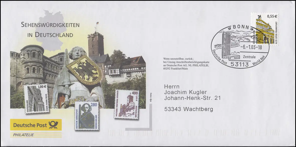 Lettre postale Attractions EF 2300 SWK Alte Oper SSt BONN World Net 6.1.03