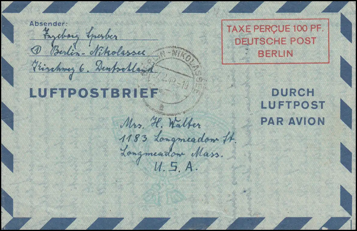 Lettre postale aérienne LF 1 II à 100 lignes Pf. double BERLIN-NIKOLASSEE 27.2.1949