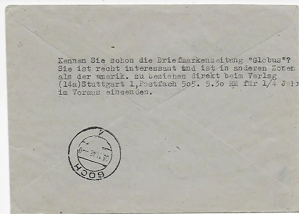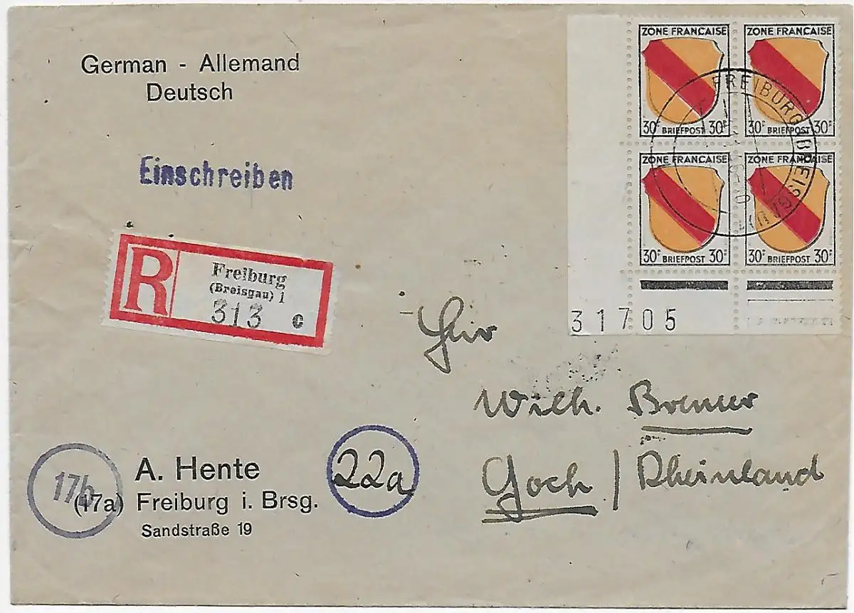 Lettre recommandé Fribourg après Goch, 1946, Quadruple avec numéro d'arc